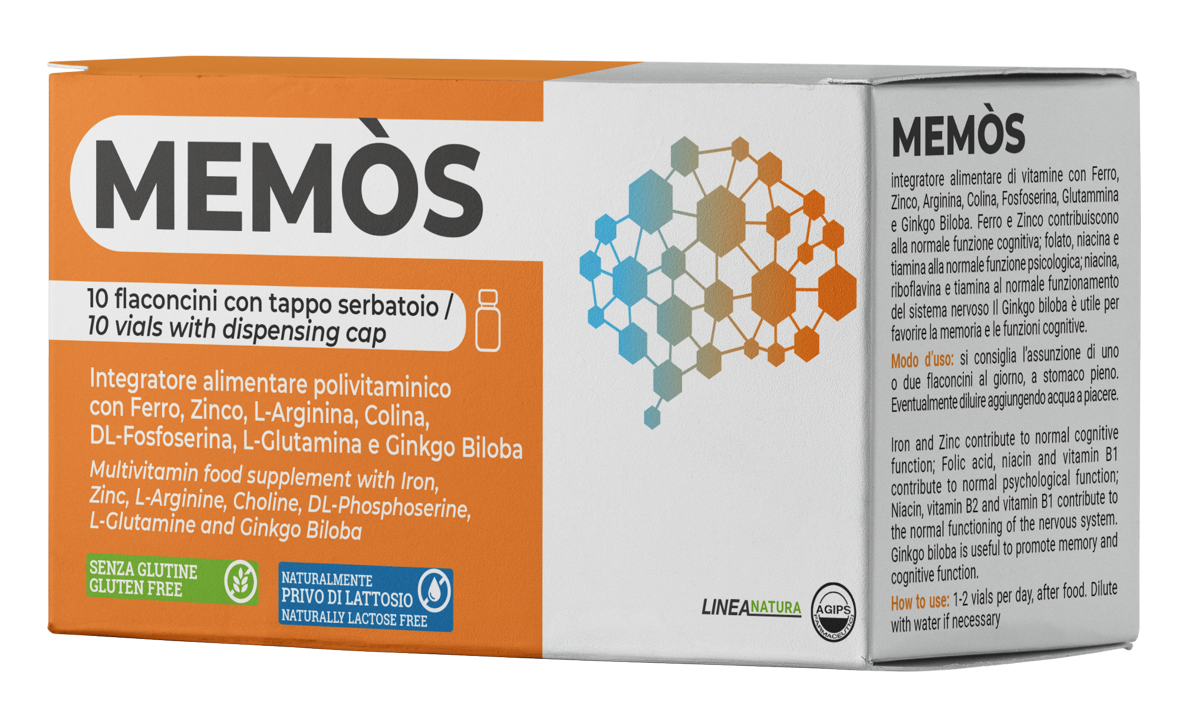 MEMOS è un integratore alimentare di vitamine con Ferro, Zinco, Arginina, Colina, Fosfoserina, Glutamina e Ginkgo Biloba. Ferro e Zinco contribuiscono alla normale funzione cognitiva; folato, niacina e tiamina alla normale funzione psicologica; niacina, riboflavina e tiamina al normale funzionamento del sistema nervoso. Il Ginkgo Biloba è utile per favorire la memoria e le funzioni cognitive.